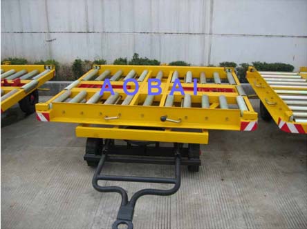 产品性能 本车工作台面上装有 26 根镀锌的滚筒便于集装箱的装卸。 尾部装有自锁式挂钩,防止后车脱钩。 拖把具有多车连接和刹车双重功能。 前轴装有特制转盘使车辆在行驶过程中转向自如。 轮胎采用超耐磨实芯轮胎,使用寿命长。 装载形式:侧面装载